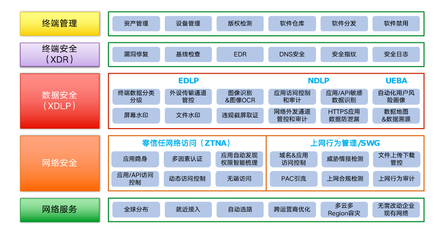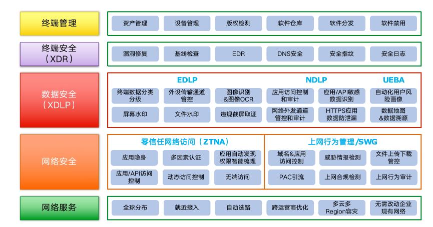 一体化安全客户端,把终端上网流量牵引至SASE安全云,云网端结合提供零信任网络访问(ZTNA)、数据防泄漏(XDLP)、终端安全防护(XDR)、上网行为管理、网络准入、桌面管理等一体化安全能力。