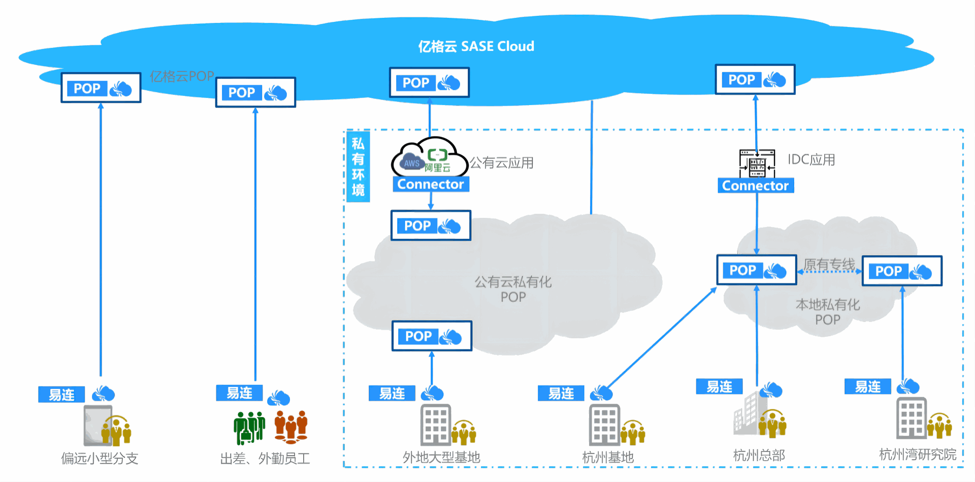 - 混合云架构:基地使用私有网关,偏远小型分支、出差场景租用亿格云网关。自动容灾切换。